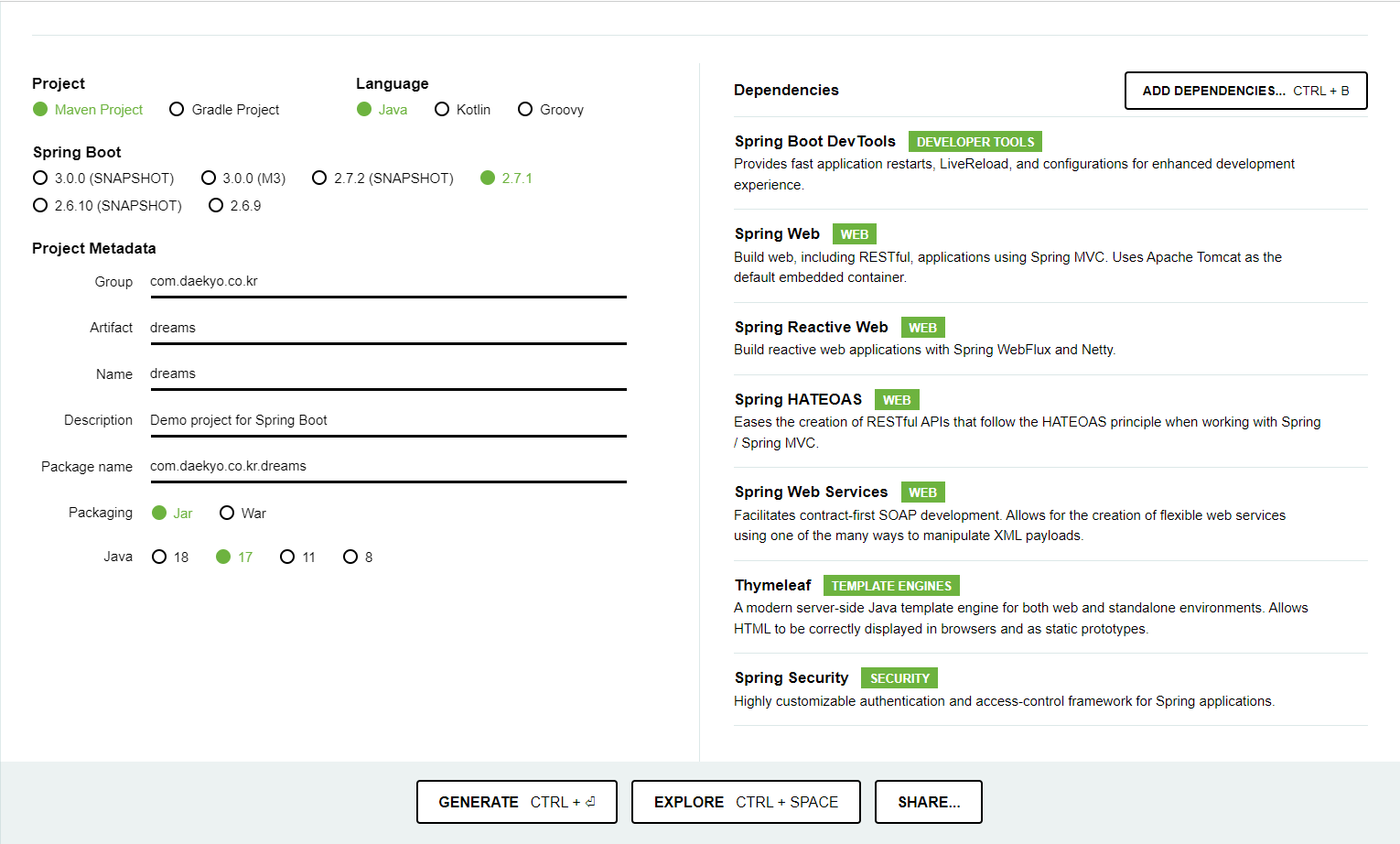 https://start.spring.io/ 에서 SpringBoot 프로젝트를 생성했다.