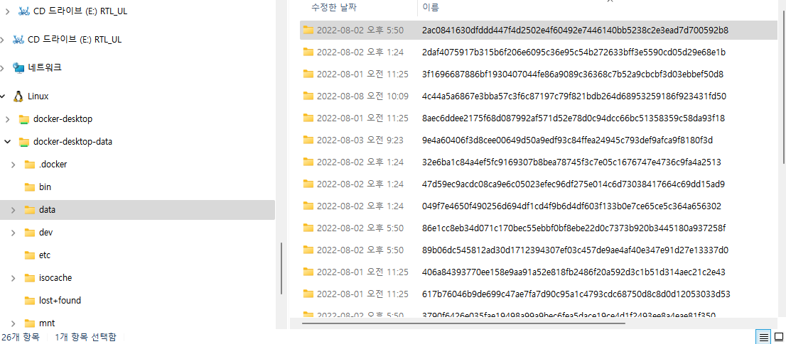 혹시 docker desktop에 버전에 따라서 다를 수 있지만 웹에 검색해 보면 된다. - Windows에 탐색기를 열어 보면 이미지와 같이 Linux영역에 Drive가 새로 생성된다