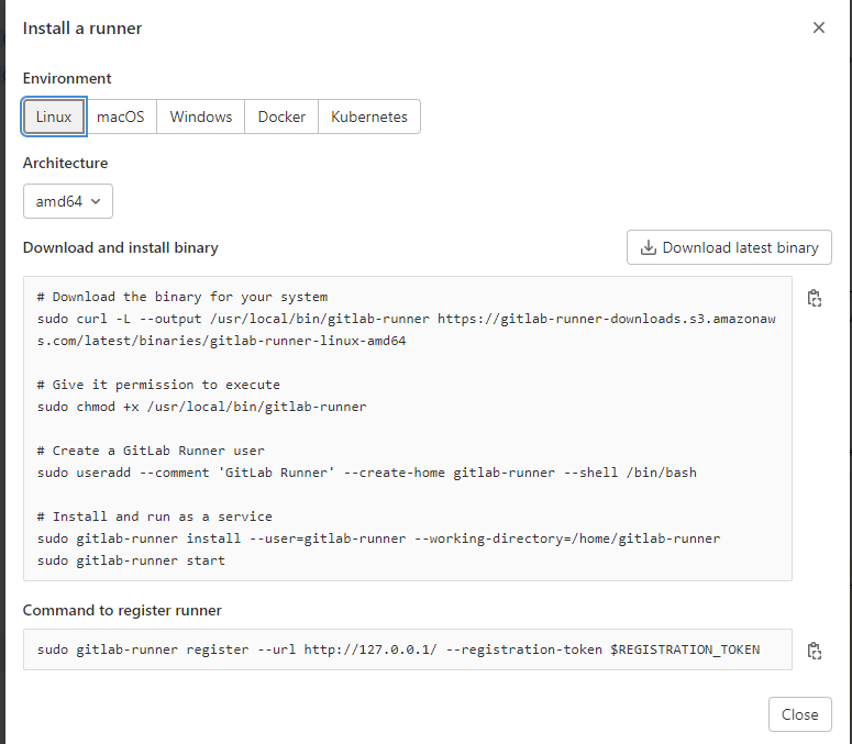 - Gitlab > Settings > CI/CD > Runners > Expand > Show runner installation instructions 클릭