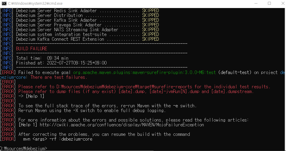 만약 위와 같은 에러가 나면 -DskipITs 옵션을 추가하자 - 하다보면 쓰지 않는 모듈이 추가 돼서 에러가 나는 부분도 있다.