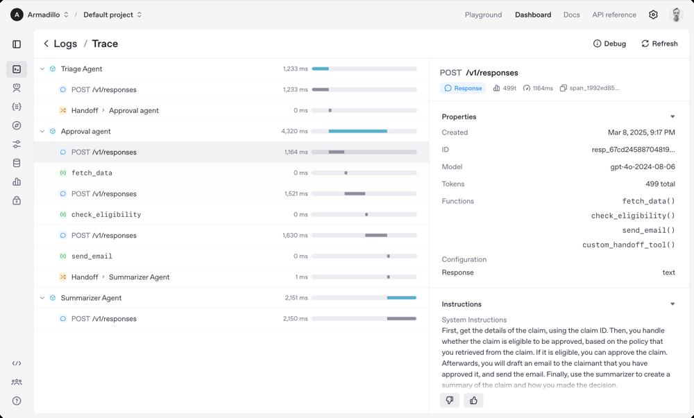 OpenAI Agent SDK의 추적(Tracing) UI 예시 화면입니다. 좌측에는 에이전트들이 주고받은 메시지와 툴 호출 내역이 시간 순서대로 로그로 나타나고, 우측에는 각 단계별 토큰 사용량, 응답 유형, 입력 파라미터 등의 상세 정보가 표시됩니다. 이러한 내장된 추적 기능을 통해 개발자는 에이전트의 동작 과정을 투명하게 살펴볼 수 있으며, 복잡한 멀티 에이전트 시나리오에서도 어디서 문제가 발생했는지 디버깅하고 성능을 최적화할 수 있습니다