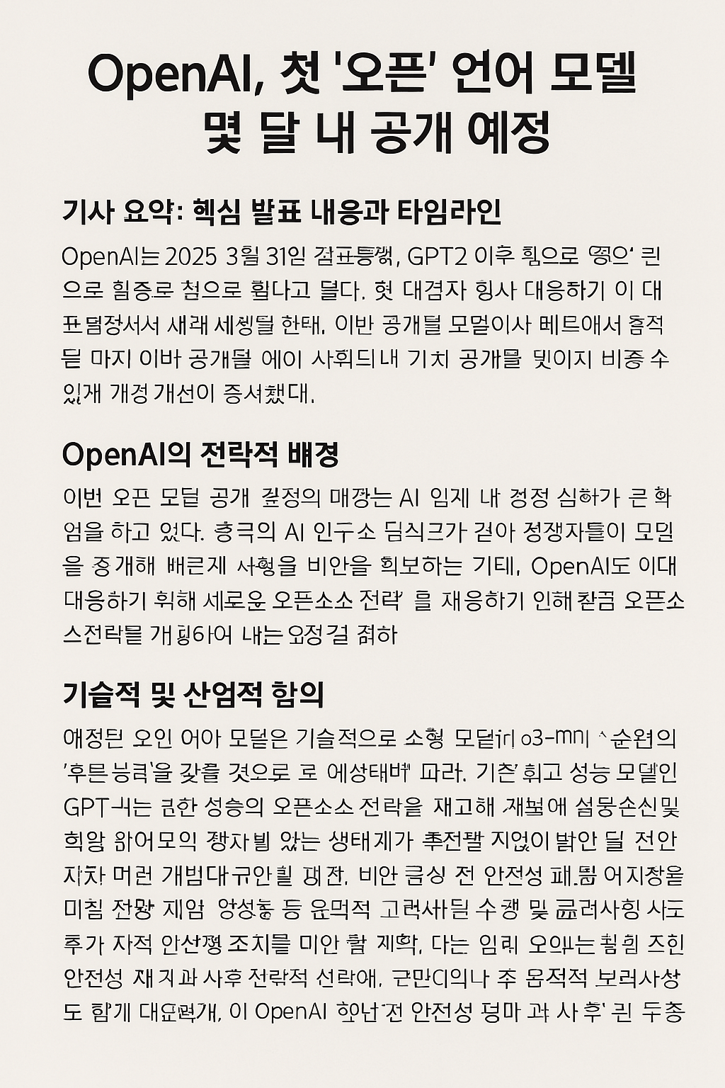 OpenAI는 2025년 3월 31일 발표를 통해, GPT-2 이후 처음으로 ‘오픈’ 언어 모델을 향후 몇 달 내에 공개할 계획임을 밝혔다. 이번 발표는 OpenAI가 개발자와 연구자 등 커뮤니티의 의견을 수렴하기 위해 피드백 폼을 공개하면서 알리게 되었으며, 첫 개발자 행사는 샌프란시스코에서 몇 주 내로 열릴 예정이고, 이후 유럽과 아시아태평양 지역에서도 추가 세션이 계획되어 있다. 또한, OpenAI의 엔지니어는 올해 안에 사용자가 자신의 하드웨어에서 실행할 수 있는 모델을 출시할 것이라고 밝혀, 이번 공개될 모델이 로컬 환경에서 구동될 가능성이 있음을 시사했다.
