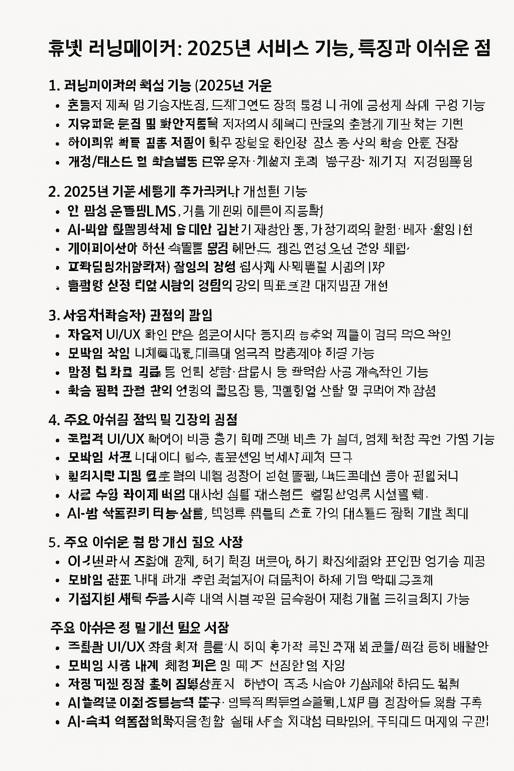AI 활용의 제한성: 러닝메이커는 AI 기반 콘텐츠 추천 기능을 탑재하고 있으나, 생성형 AI를 통한 자동 콘텐츠 제작, 학습자 응답 분석 및 실시간 피드백 제공 등의 기능은 아직 제한적입니다. 향후 학습자 질의응답 자동화, 강의 요약 자동 생성, 개별 피드백 작성 등 더욱 진화된 AI 활용이 추가된다면 플랫폼의 학습 효과와 효율성이 한층 높아질 수 있습니다.